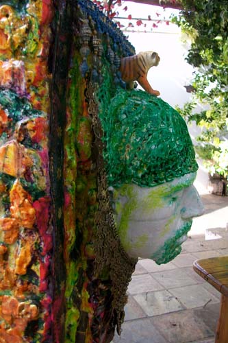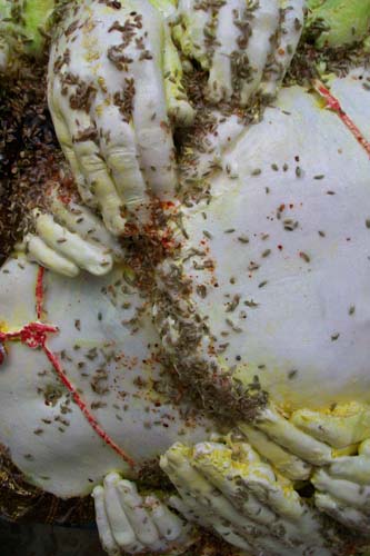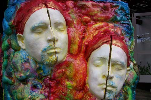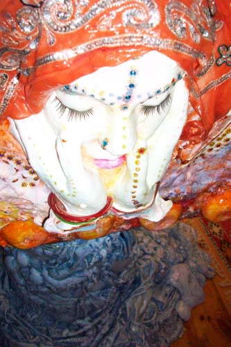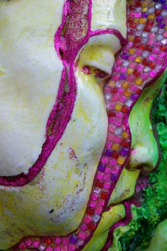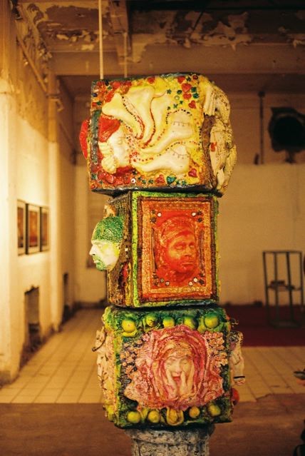 This idea, after much trial, eventually separated into two installations – a pile of 36 too-large-to-eat samoosa’s and the adorned blocks, which form a pillar. Both installations offer a sampling or Taste of Bollywood and act as stand-ins for the construction of this glorious industry. In the installation, the samoosas function to index cultural consumption (filled with ‘cast’ of film-icons) and act as currency to the delusion that we have purchase into the ‘shrine’, – the Indian culture – via Bollywood. The pillars, a celebration of edifice, are detailed with fragments of treasures that this cultural construct is based on.