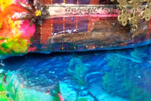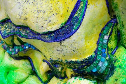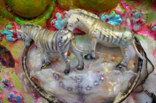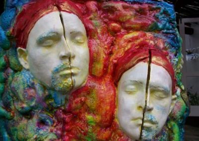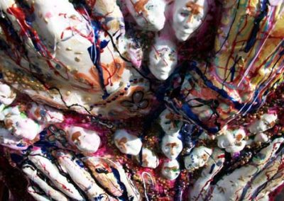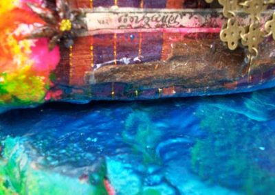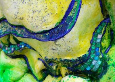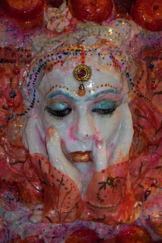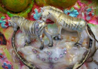 This work was part of a mentorship group-installation titled Hollywood (Tanya Poole), Nollywood (Nomusa Makhuba), Bollywood (Lindi Arbi). As an art maker, I decided not to interrogate Bollywood’s preoccupation with fantasy and romance, but rather to indulge in it. Both the content and process of this project allowed me to use all manner of materiality. I used spices, jewellery, nail polish, gorgeous cloth, glass paint, glitter, stars and sequins, and the colors that are used in the Hindu Festival of Holi Colours with unadulterated joy and abundance. I have combined these materials with more traditional artmaking processes and have included casts of my children’s hands and faces in polyurethane and resin as a metaphor for honoring traditional family values.