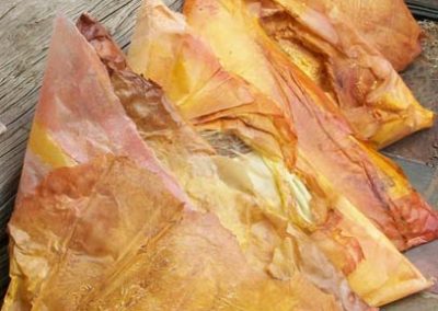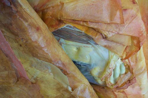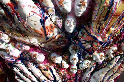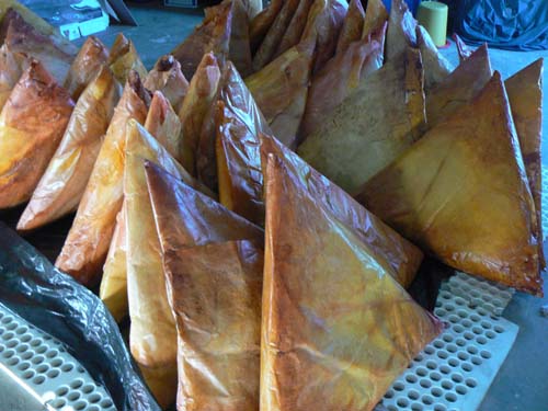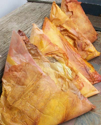 36 samoosas. 1m x triangles. waterproofing agent, paint, fiberglass tissue, polyurethane, waste stuffing, body casts.