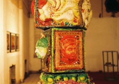 Pillars are vertical supports in architectural structures, often triumphantly decorative. I deliberately made this installation awkward, visually interrupted by block-like shapes. Likewise, the industry of Bollywood film is built on embellishments of family values, love and tragedy but it is nevertheless an assembled variety of differing cultural practices precariously placed together.